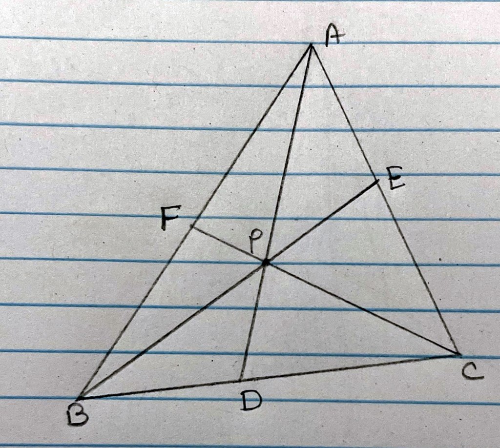 Let P be an interior point of a triangle ABC and AP, BP, CP meet the sides BC, CA, AB in D, E, F respectively. Show that
